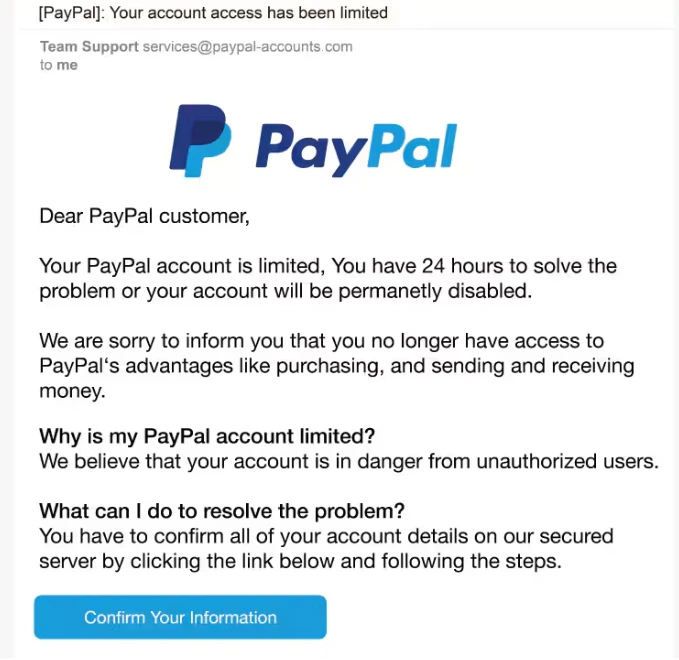 Email do PayPal: Falso. O nome do usuário não foi especificado e é uma saudação genérica. A primeira frase provoca um senso de urgência, esperando que o usuário aja sem pensar. Há também erros de gramática e ortografia no email se você olhar de perto.