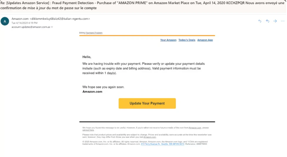 Email da Amazon: Falso. Este email de phishing da Amazon vem de um endereço suspeito, não inclui o nome do cliente e pressiona o cliente a atualizar suas informações de pagamento rapidamente.
