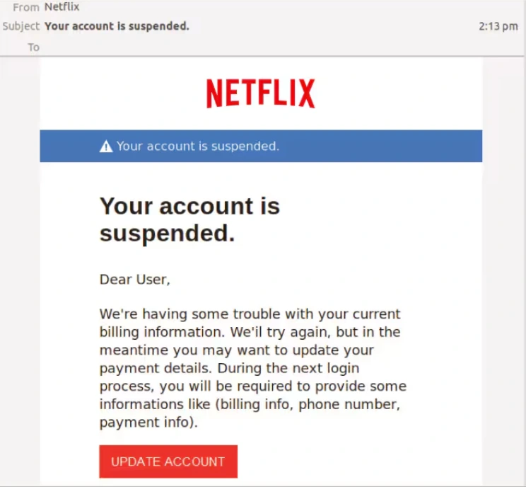 Email da Netflix: Falso. Há erros de ortografia e gramática em todo o email. O nome do cliente está ausente na saudação e o campo “Para:” está completamente em branco, significando que o email provavelmente fez parte de uma campanha de phishing maior enviada para múltiplos endereços de email.